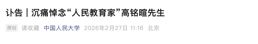 2月27日上午,中国人民大学发布讣告:沉痛悼念“人民教育家”高铭暄先生。