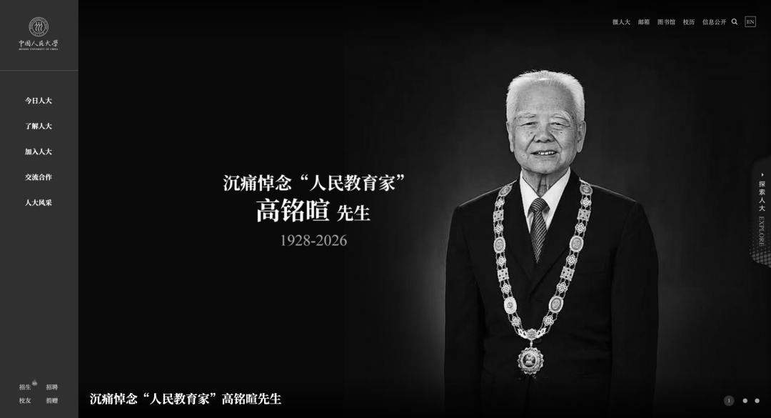 目前,登录中国人民大学网站可以看到首页已变为黑白,大图显示“沉痛悼念‘人民教育家’高铭暄先生”。