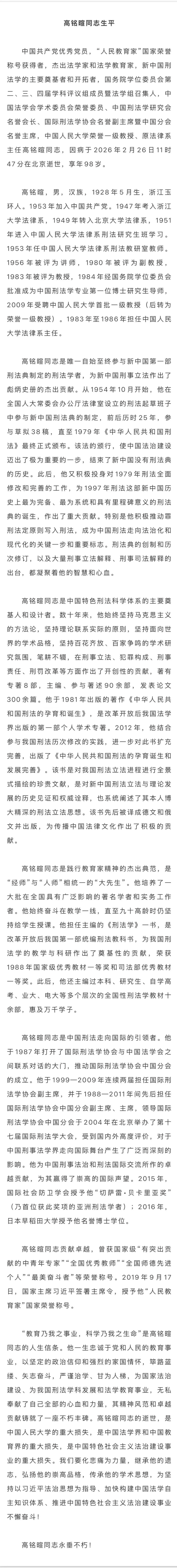 北京大学法律系1951届本科校友、“人民教育家”、中国人民大学荣誉一级教授高铭暄于2026年2月26日在北京逝世,享年98岁。