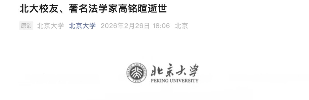 2月26日下午,北京大学发文悼念:北大校友、著名法学家高铭暄逝世。